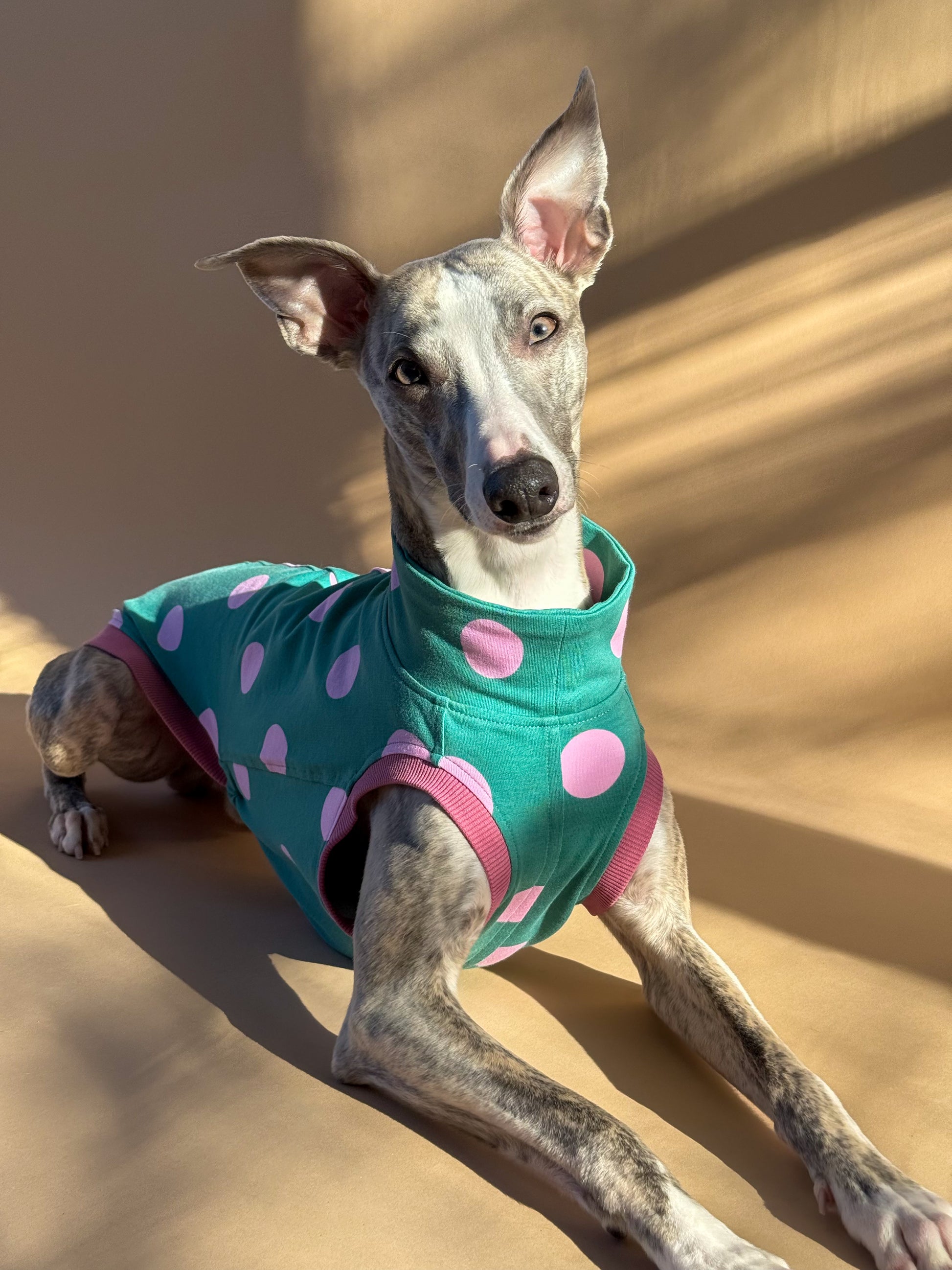 Sleeveless Whippet Shirt is designed to stay close, comfortable, and easy in motion. A sighthound-specific cut follows the body neatly, while the elastic belly band keeps the fit secure without feeling tight, helping the vest stay in place as your dog runs, stretches, and explores. Made from soft cotton, it feels breathable and flexible, making it a great stand-alone piece in mild weather or a smooth base layer under a coat on cooler days. Finished with a playful polka-dot pattern for a standout look.
