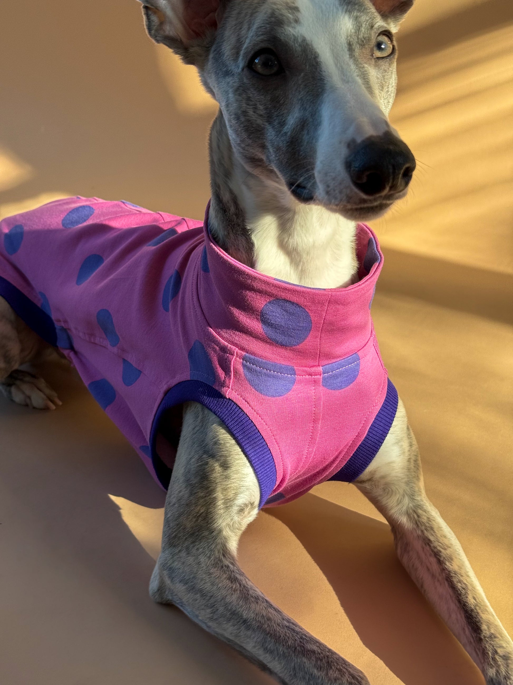Sleeveless Whippet Shirt is designed to stay close, comfortable, and easy in motion. A sighthound-specific cut follows the body neatly, while the elastic belly band keeps the fit secure without feeling tight, helping the vest stay in place as your dog runs, stretches, and explores. Made from soft cotton, it feels breathable and flexible, making it a great stand-alone piece in mild weather or a smooth base layer under a coat on cooler days. Finished with a playful polka-dot pattern for a standout look.